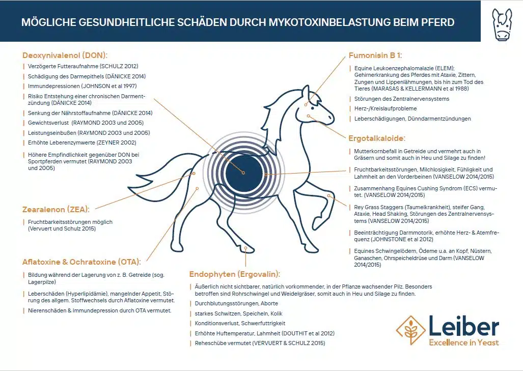 Es sind mehr als 300 Mykotoxine bekannt, die von mehr als 100 Schimmelpilzarten (u.a. Aspergillus, Penicillium, Fusarium) produziert werden. Besonders gefährlich sind Aflatoxine, Ochratoxine, Zearalenone (ZEA), DON, Fumonisine und vermehrt auch giftige Mutterkorn-Ergotalkaloide im Getreide, aber auch Grasbestand. Wissenschaftliche Untersuchungen zeigen, dass die Mykotoxine DON und ZEA am häufigsten im Pferdefutter vorkommen und ebenso häufig in Urin- und Blutproben von Sportpferden nachgewiesen werden. Pferde scheinen jedoch gegenüber DON und ZEA weniger sensibel zu sein. Eine deutlich höhere Sensibilität, zeigt sich gegenüber Fumonisin B 1, Endophyten und Ergotalkaloide. Zu Aflatoxine und OTA, fehlen derzeit genauere Untersuchungen, jedoch scheinen auch hier Pferde sehr empfindlich zu sein. Die derzeitige Praxis – bestehende Mykotoxin Grenz- oder Orientierungswerte für Schweine oder Wiederkäuer, auf Pferde zu übertragen – ist daher nicht ratsam. Eigene Werte für Pferde liegen derzeit nicht vor, allenfalls Empfehlungen.